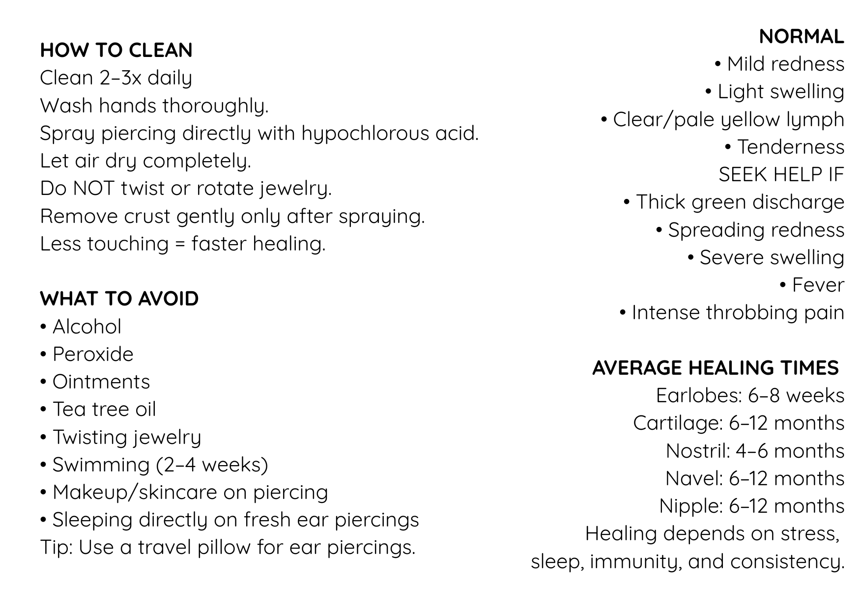 Piercing is just the beginning—how you care for it matters most. Our aftercare approach supports your body’s natural healing while allowing room for individual needs and intuition.
